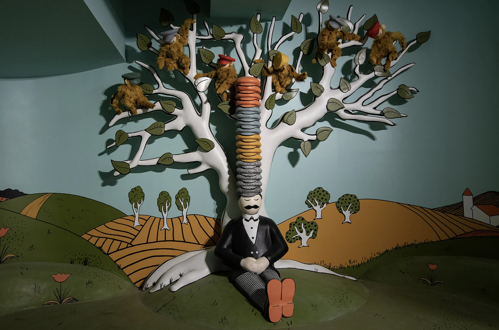 Monkeys scold the cap peddler from the trees of the “Caps for Sale” exhibit, based on the book by Esphyr Slobodkina; photo by Julie Denesha, KCUR