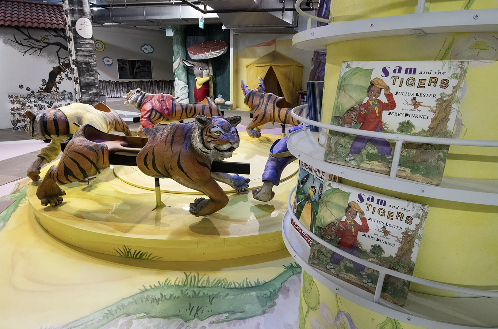 Each exhibit includes bookshelves, including a still-in-progess exhibit based on the book “Sam and the Tigers,” by Julius Lester; photo by Julie Denesha, KCUR