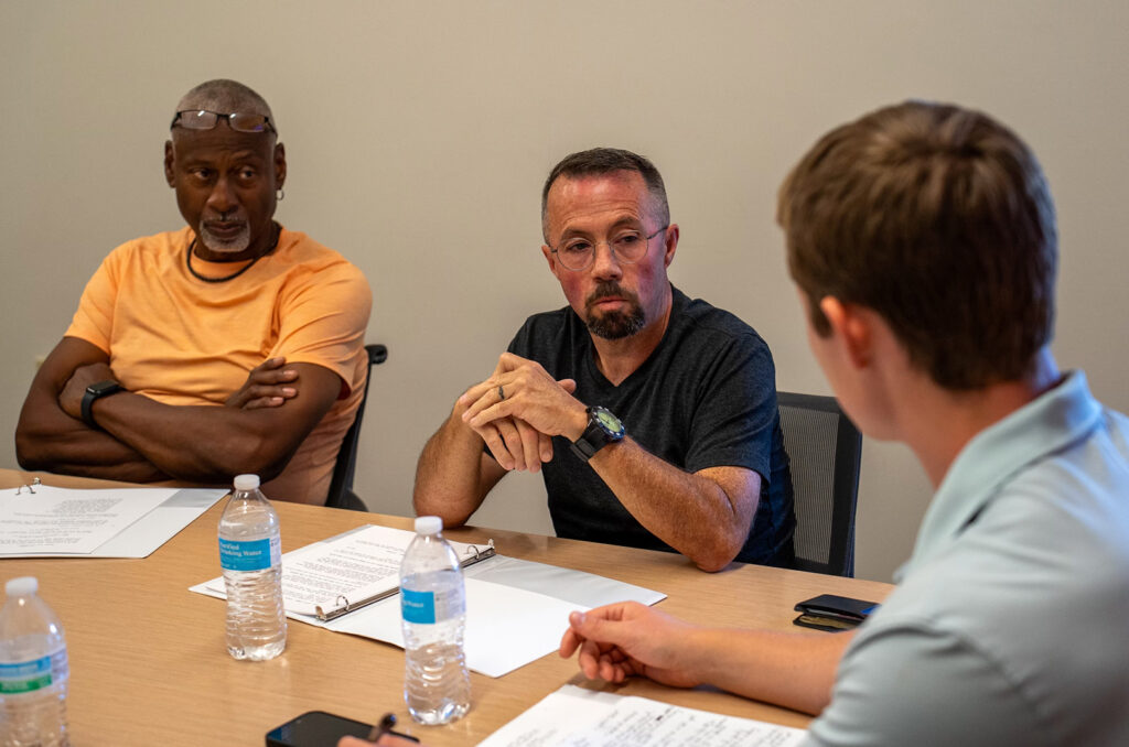 Actors Stewart Johnson and Rixie Ray engage with filmmaker Thomas Rex during a table read session for “In Plain Sight”; photo courtesy of Thomas Rex