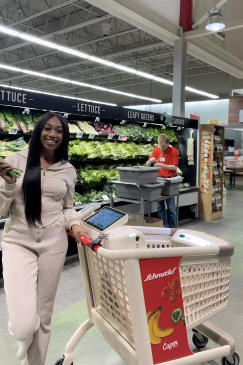 TikTok creator Gabbie Wiggins is photographed at a Schnucks grocery store filming a video for her account, which promotes foods and things to do in the St. Louis area; photo courtesy of Gabbie Wiggins