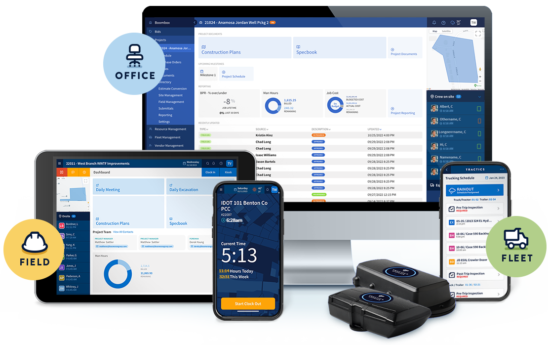 “From time tracking, to foreman time and quantity management, to project management for the heavy general contractor,” he continued. “Then we’ve also built a whole Fleetmatics component — where we have our own beacon set — and we integrate with the OEM manufacturers. We do dispatching, load cycling, haul truck tracking. And we integrate all that back down into this field data at the same time, so that you can truly get a field office window as a general contractor.”