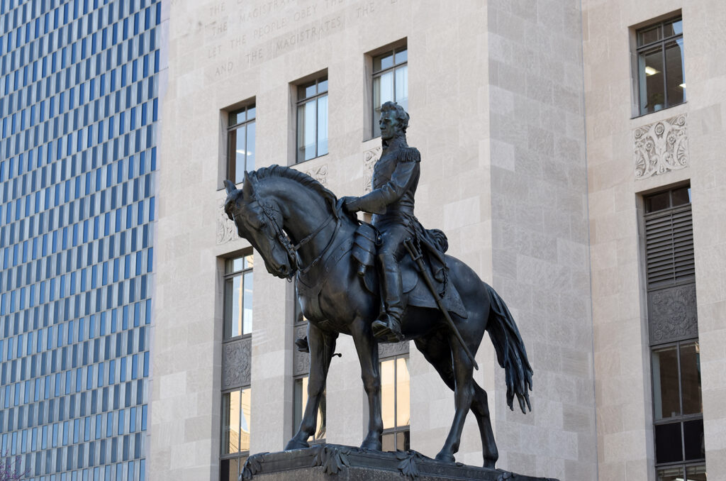 A statue honoring Andrew Jackson — the controversial U.S. president, military leader and namesake of Jackson County — stands outside the Jackson County Courthouse in downtown Kansas City, facing KCMO’s City Hall; photo by Taylor Wilmore, Startland News