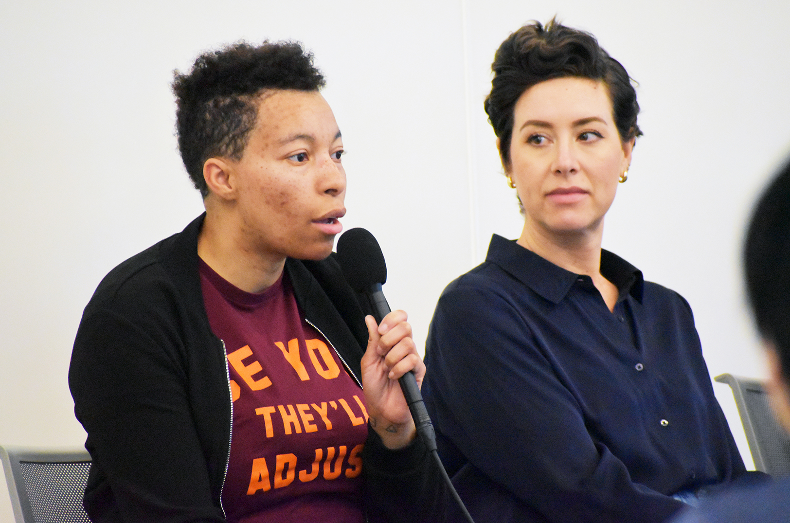 Charlotte Clark, Foresight; and Callie England, UMKC Innovation Center; share their experiences panel conversation during Startland News and the KU School of Business’ entrepreneurial lunch and learn series; photo by Austin Barnes, Startland News