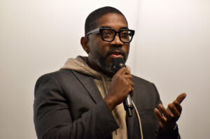 Moderator Joel Barrett speaks during a founder panel conversation at UMKC’s First Tuesdays; photo by Nikki Overfelt Chifalu, Startland News