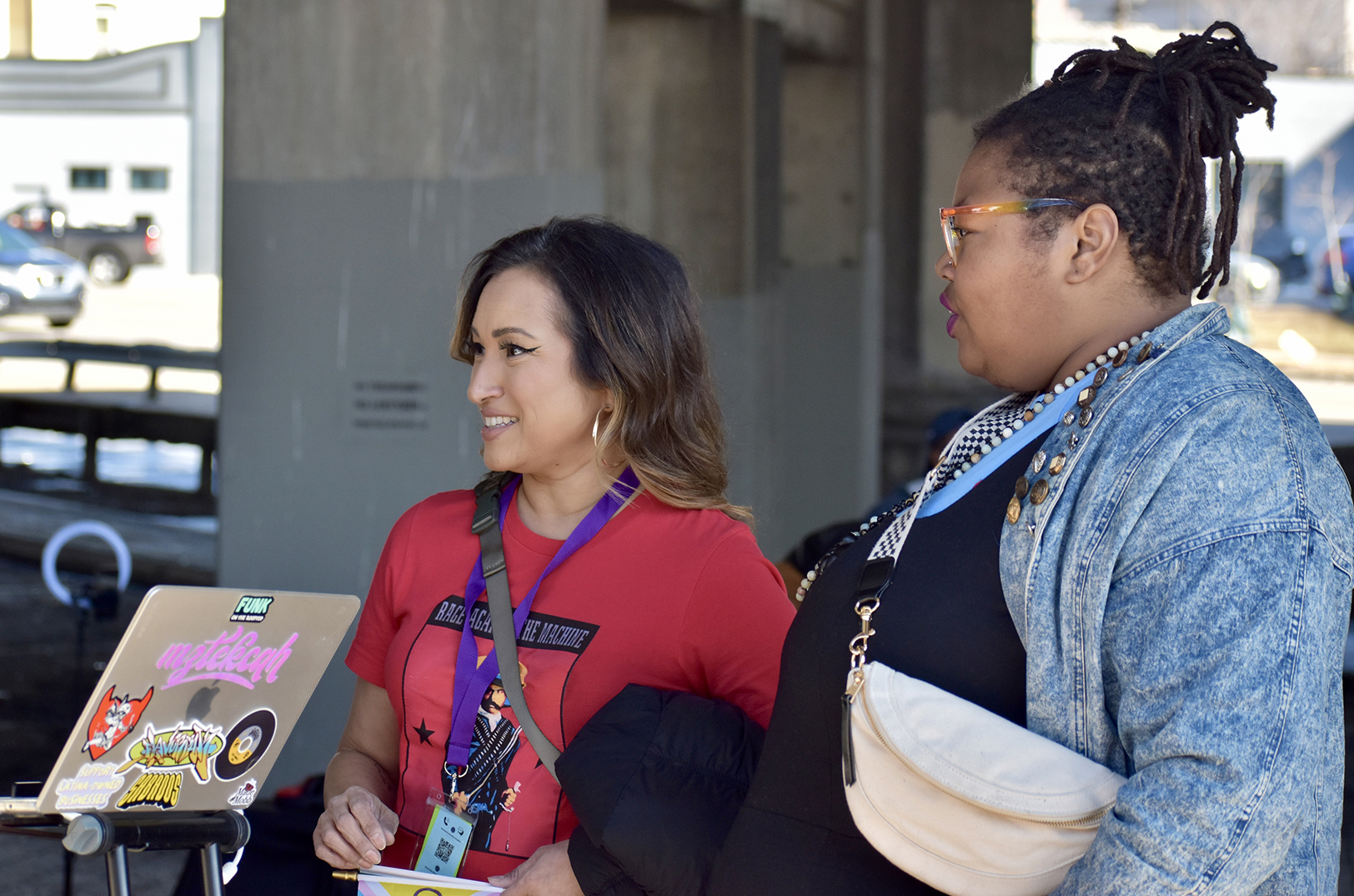 Deanna Munoz, founder of Chicano Center for the Arts, stands alongside Melissa Ferrer Civil, poet laureate for Kansas City, Missouri, during the Unidos Rally for Immigrants and LGBTQIA+ Rights; photo by Nikki Overfelt Chifalu, Startland News