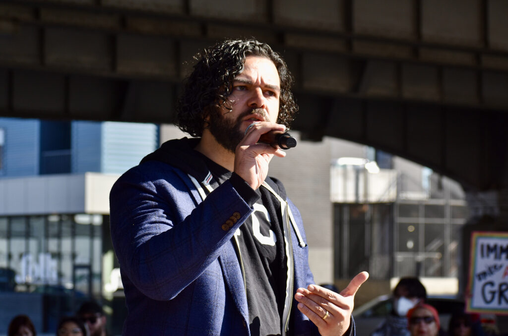 Danny Soriano sings during the Unidos Rally for Immigrants and LGBTQIA+ Rights; photo by Nikki Overfelt Chifalu, Startland News