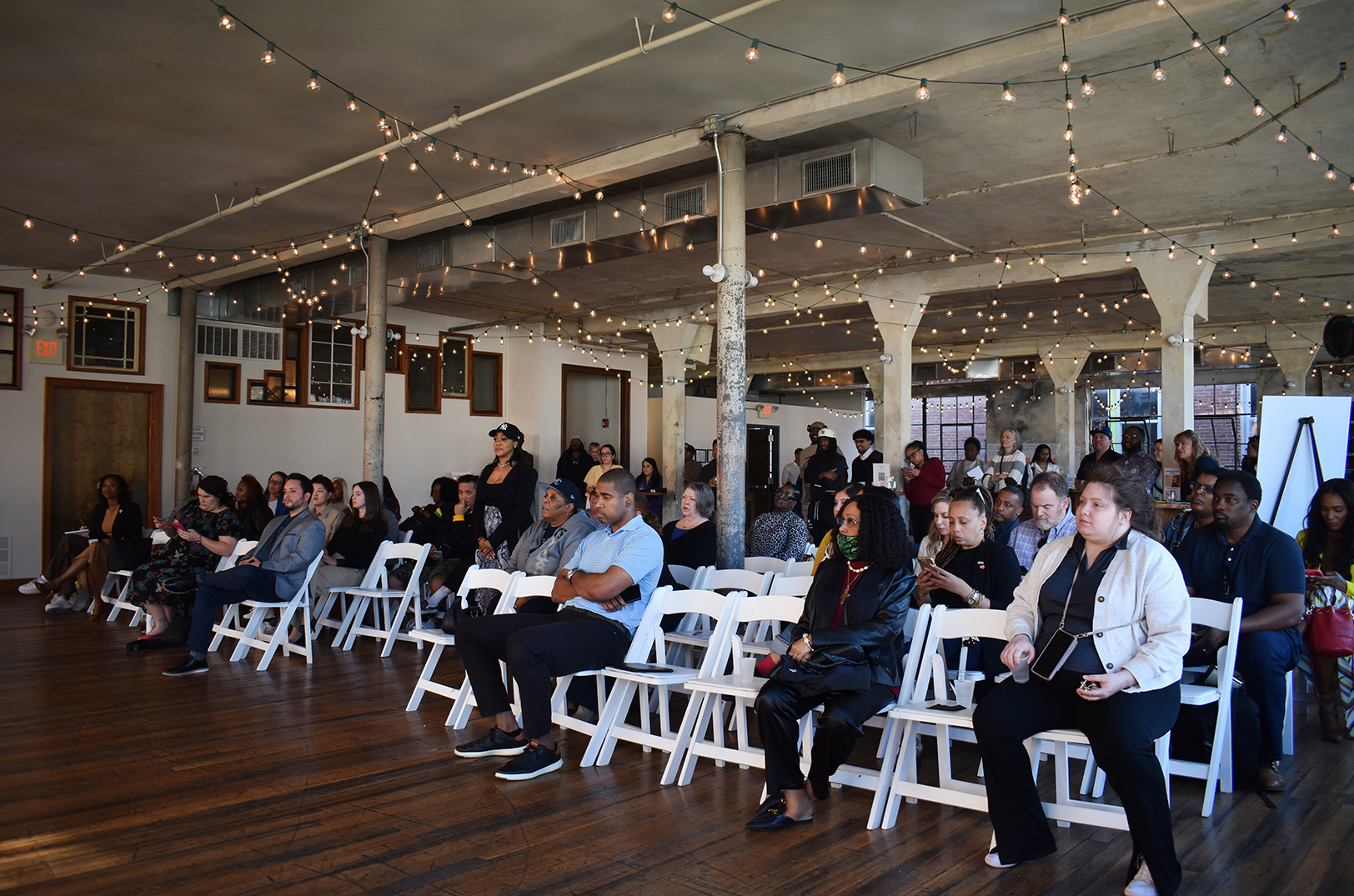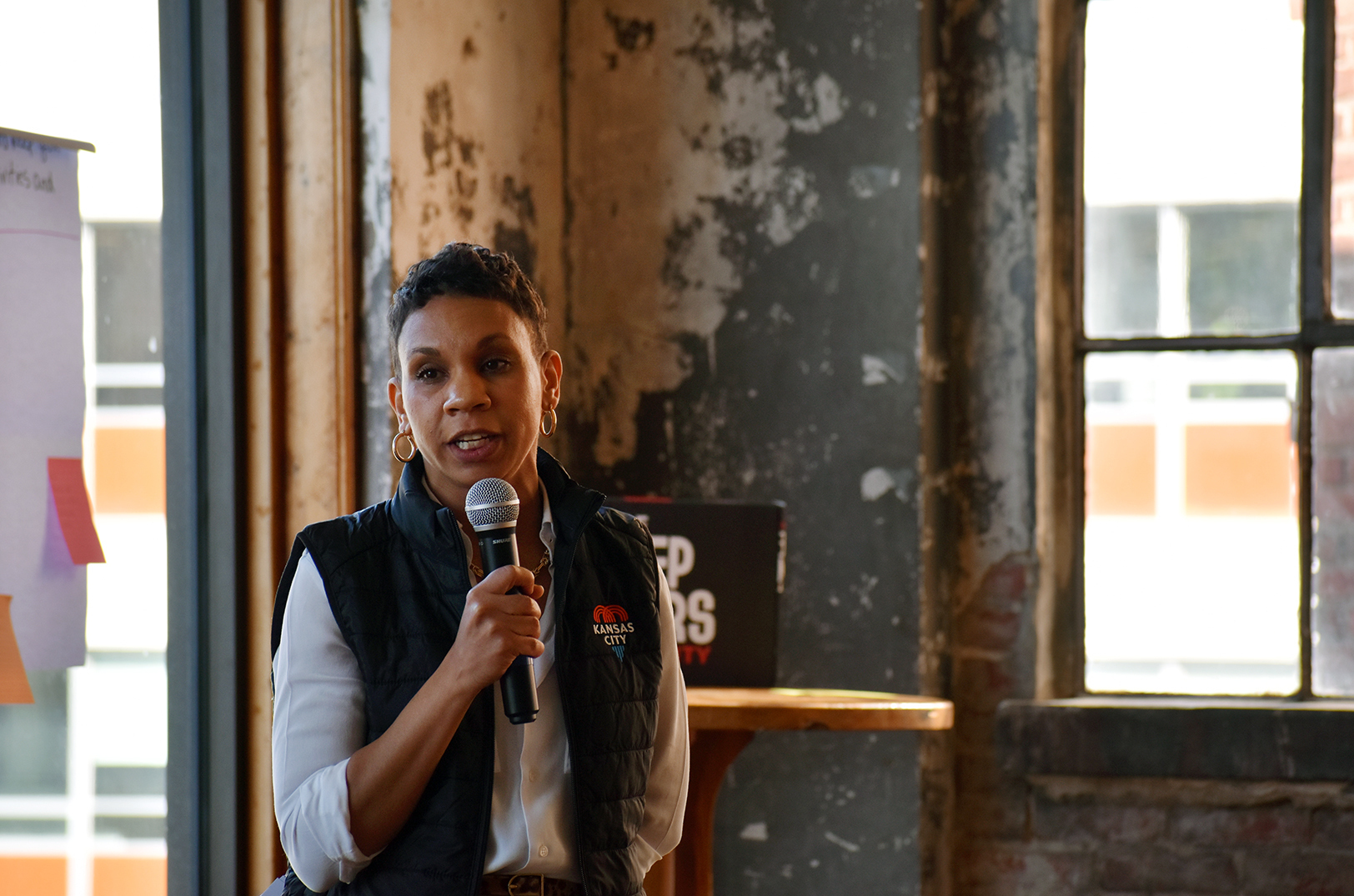 Nia Webster, assistant director of KCMO’s Neighborhood Services Department, which oversees the KC BizCare Office among other operations, addresses a crowd of entrepreneurs and small business representatives in April during a town hall event designed to discuss World Cup challenges and opportunities; photo by Taylor Wilmore, Startland News