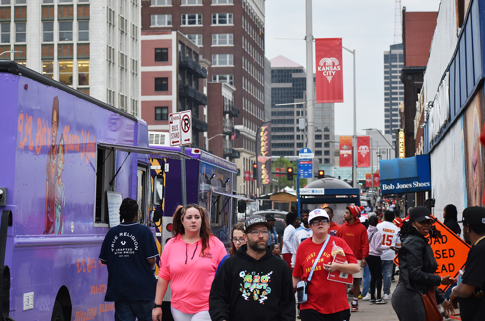 Fans and food trucks line the streets of Kansas City leading to Union Station in April 2023 as the NFL Draft approached; photo by Austin Barnes, Startland News