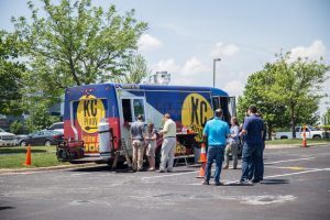“We just ran out of food. Sorry,” Nucum called out the window of the converted Kansas City Area Transportation Authority shuttle. “Yes, that is good — just not good for you.”