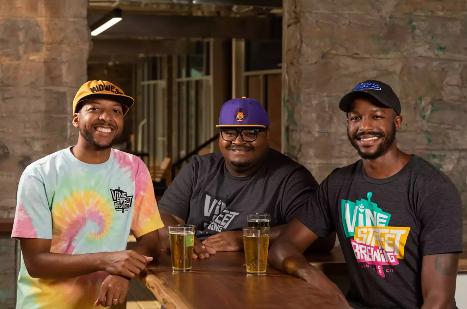 From left, Vine Street Brewing Company co-founders Kemet Coleman, Woodie Bonds Jr., and Elliott Ivory with their craft beer creations on the ground floor of the new brewery at 2010 Vine St. in Kansas City, Missouri; photo courtesy of Vine Street Brewing