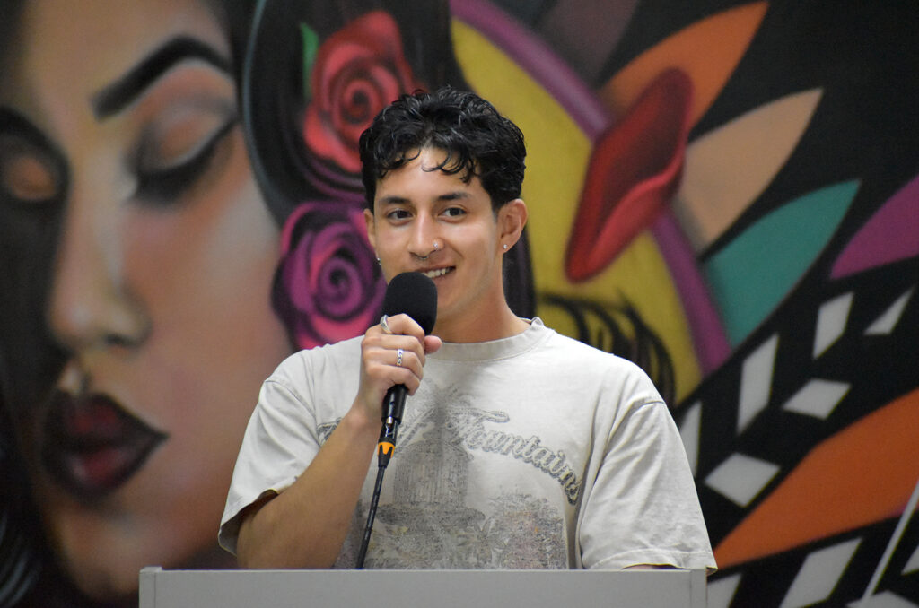 Danny Soriano, High Resolution Media, reads a poem about his mother during the ¡Viva La Chicana! Awards; photo by Taylor Wilmore, Startland News