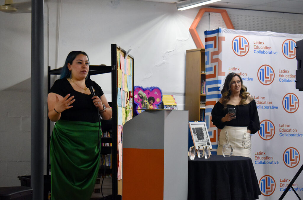 Susana Elizarraraz, chief community officer at the Latinx Education Collaborative, left, speaks during the ¡Viva La Chicana! Awards; photo by Nikki Overfelt Chifalu, Startland News