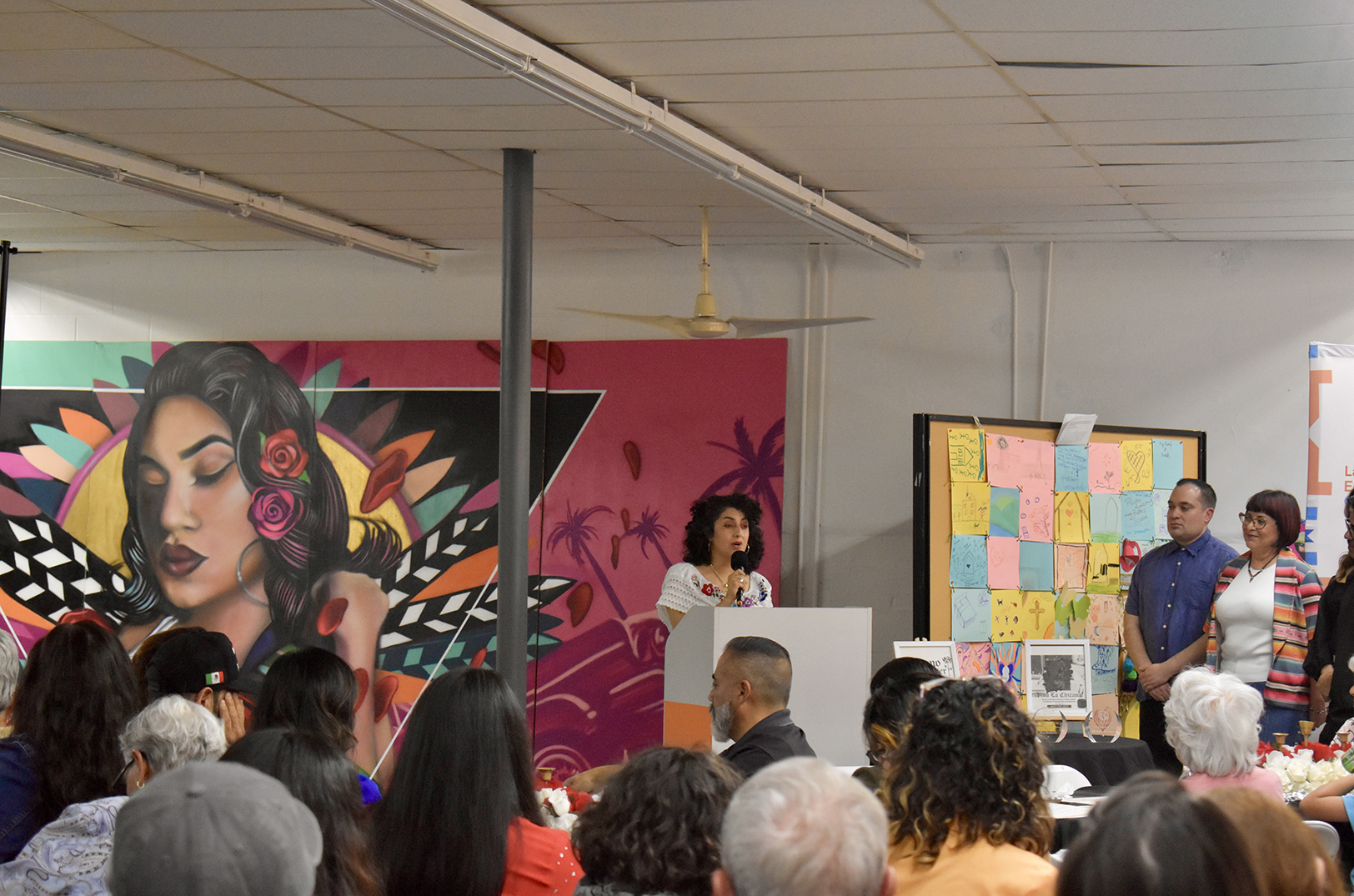 Susana Elizarraraz, chief community officer at the Latinx Education Collaborative, left, speaks during the ¡Viva La Chicana! Awards; photo by Nikki Overfelt Chifalu, Startland News