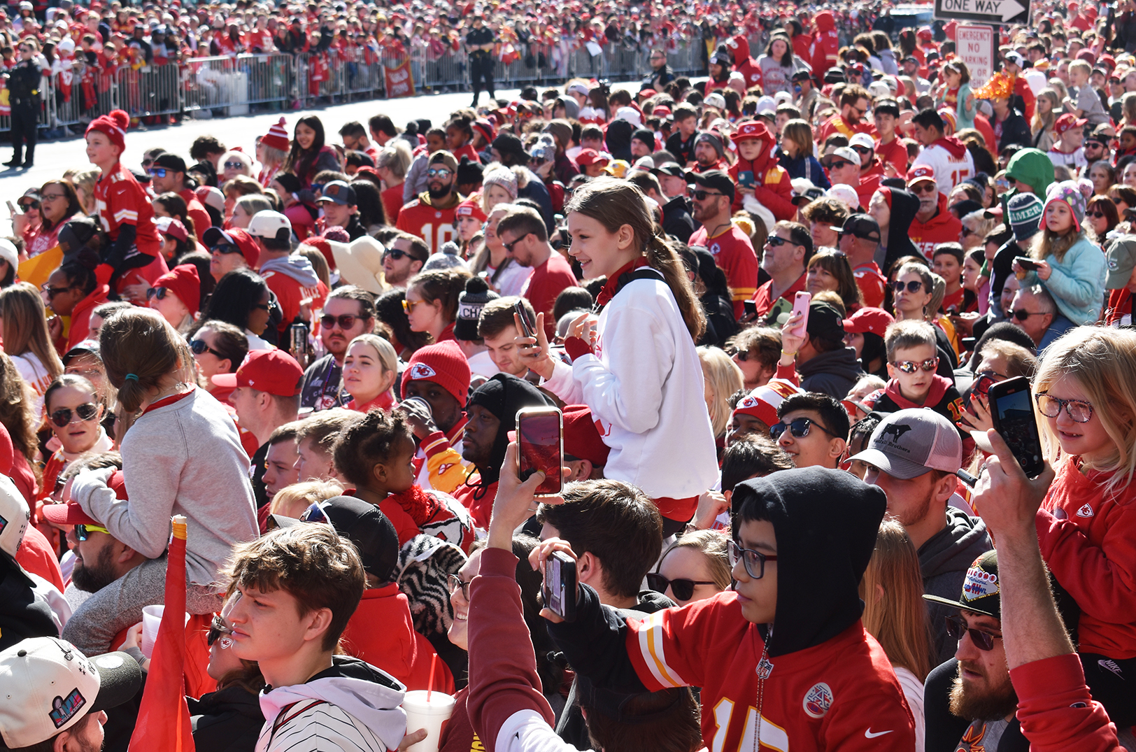 Chiefs fans gather outside the T-Mobile Center in the Power & Light District in downtown Kansas City during the team’s 2024 victory parade; photo by Taylor Wilmore, Startland News