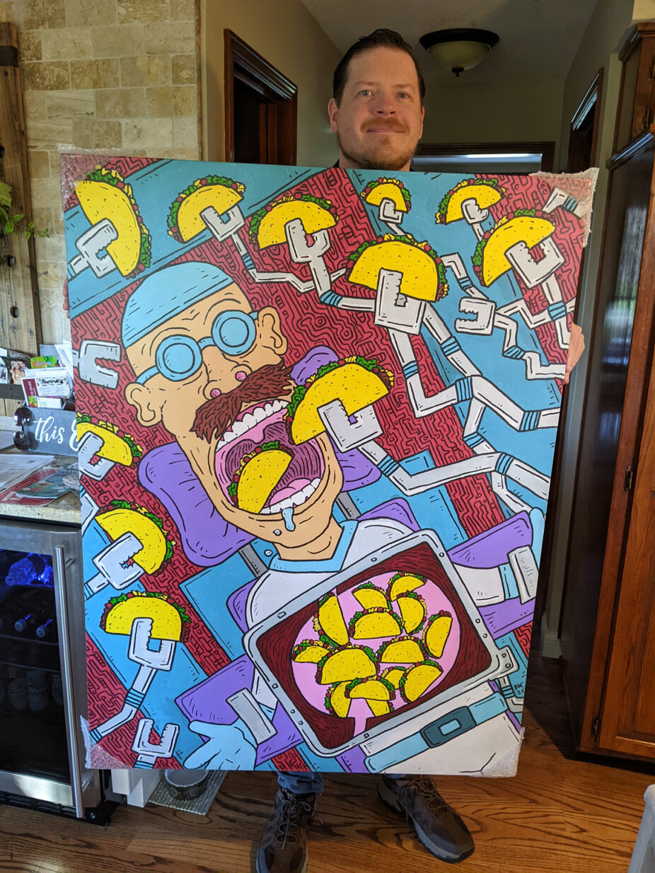 The launch of the podcast inspired him to start taco paintings, Keith continued. His first featured ghost presidents eating tacos and it sold immediately. He even got commissioned for taco murals — ghost rock stars eating tacos in space and a futuristic taco-eating machine — for two now-closed Session Taco locations.