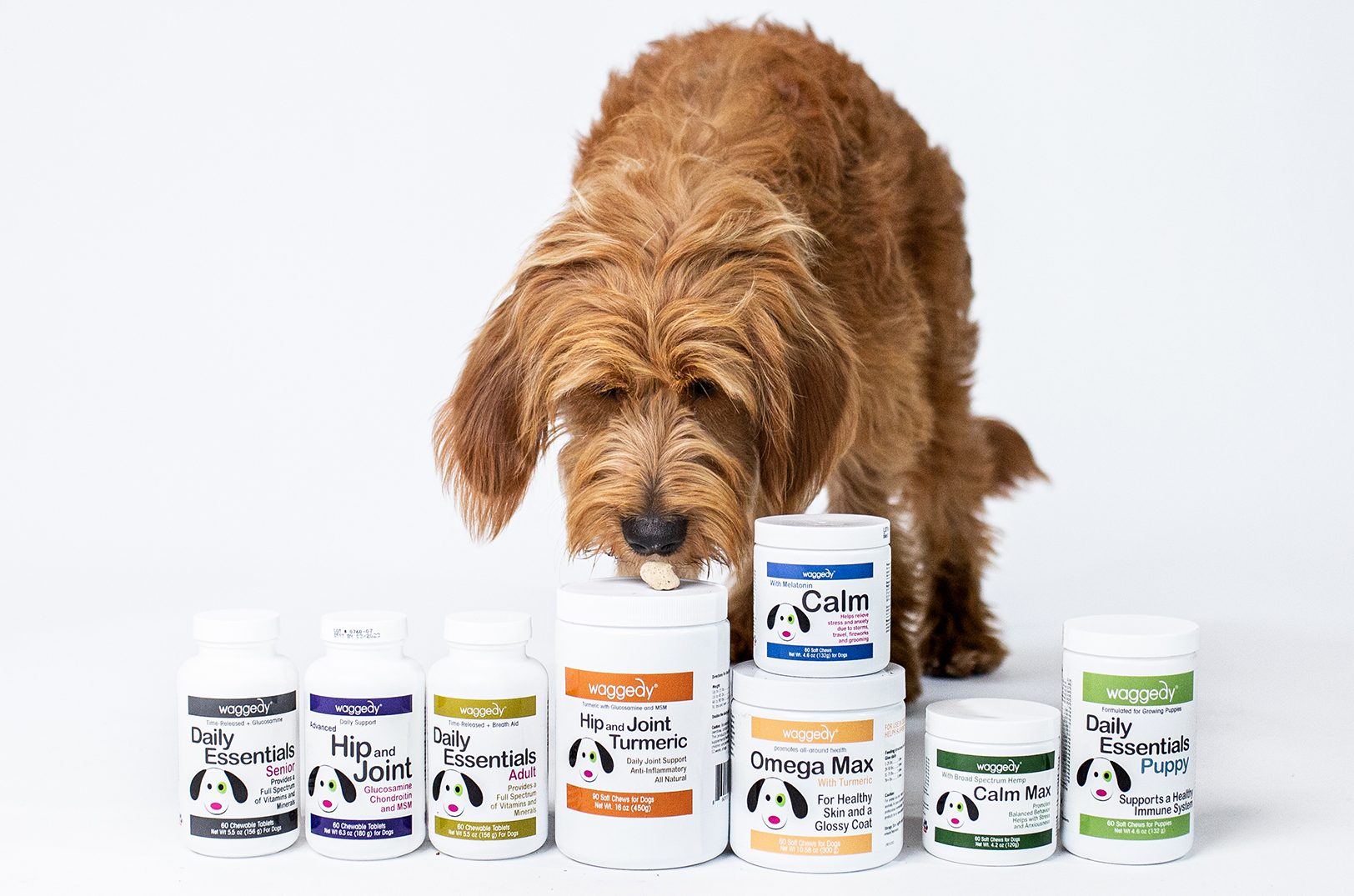 Waggedy — available through its own website and on Amazon and Chewy — offers daily essential vitamins for puppies, adult dogs, and senior dogs, plus probiotics and calming, hip and joint, and omega supplements.