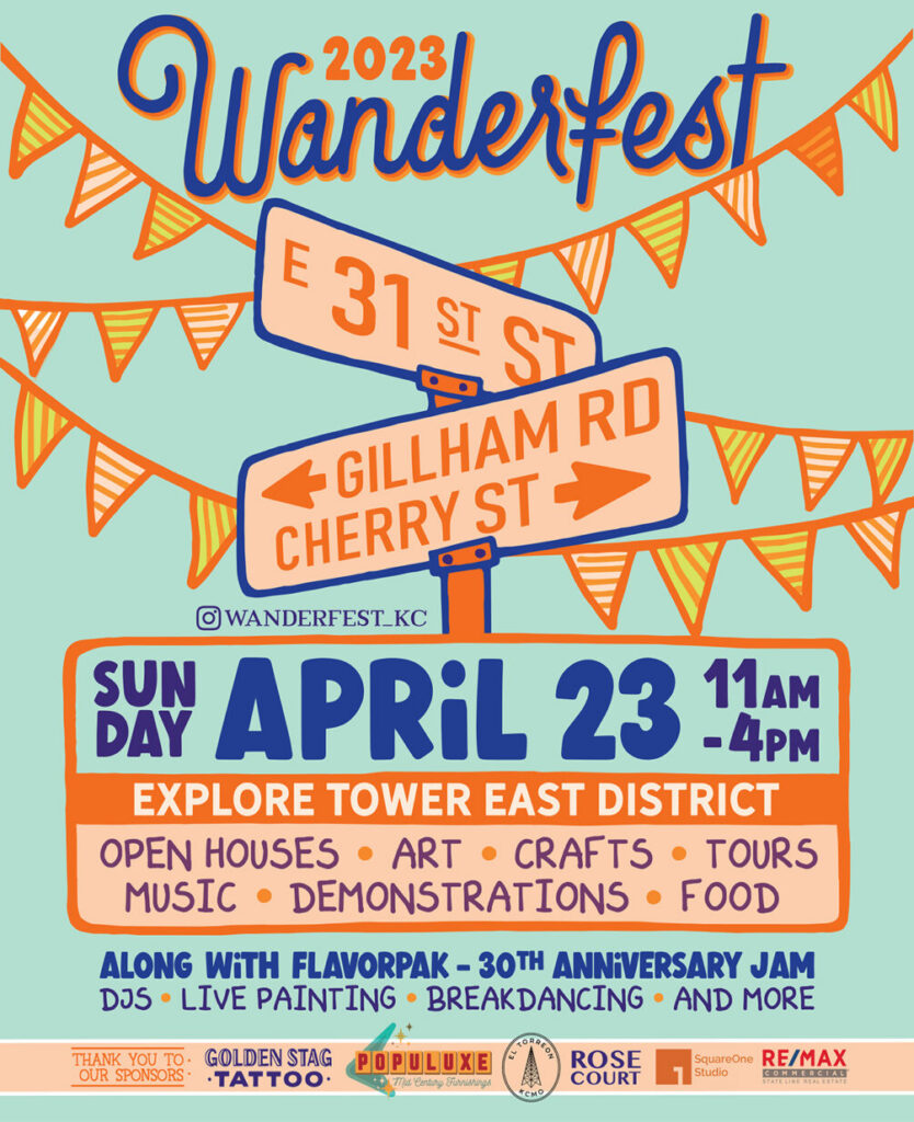 Some of the highlights, they noted, will be specials and Wanderfest-themed flash at Golden Stag Tattoo; a presentation of New Eras and Recollections by Kansas City Art Institute senior printmaking students at Golden Stag Gallery; vendors and makers at Cherry Pit Collective; specials at Oddities Prints; Peaches Fry Bread food truck; and live music at El Torreon.
