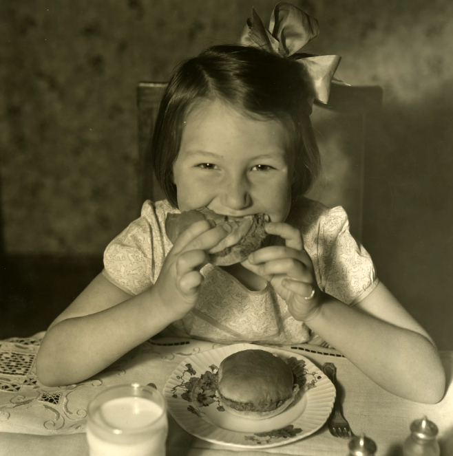 A young girl opening wide to take a bite of a White Castle hamburger, ca. 1921-1933. Photo courtesy of White Castle System, Inc./Ohio History Connection