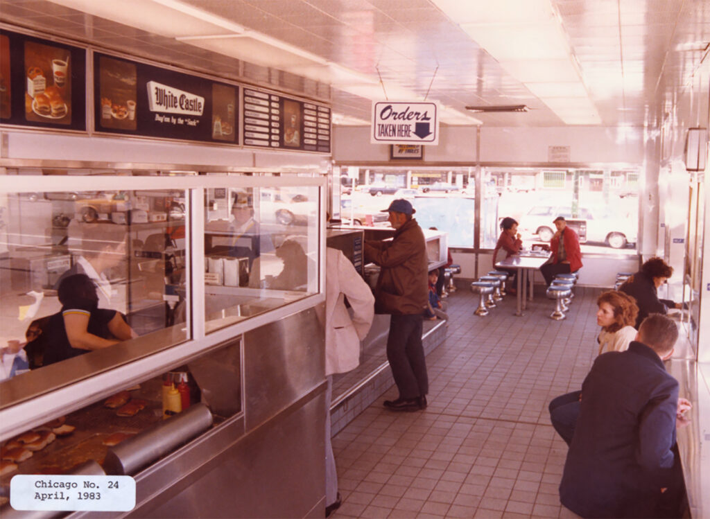 This interior view of White Castle Number 24 in Chicago, with customers placing and waiting for orders, was photographed in April 1983. Photo courtesy of White Castle System, Inc./Ohio History Connection