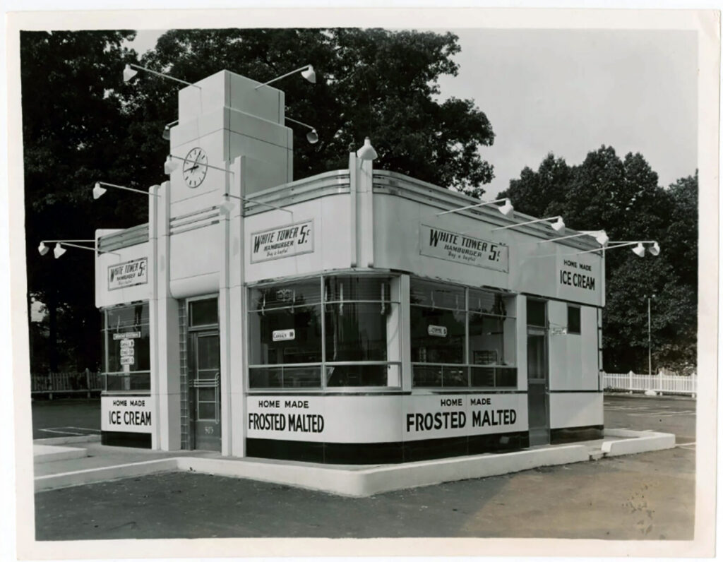 Exterior view of White Castle imitator, White Tower, in Riverdale, Maryland, in July 1939. The company slogan was “Take home a bagful.” Photo courtesy of White Castle System, Inc./Ohio History Connection