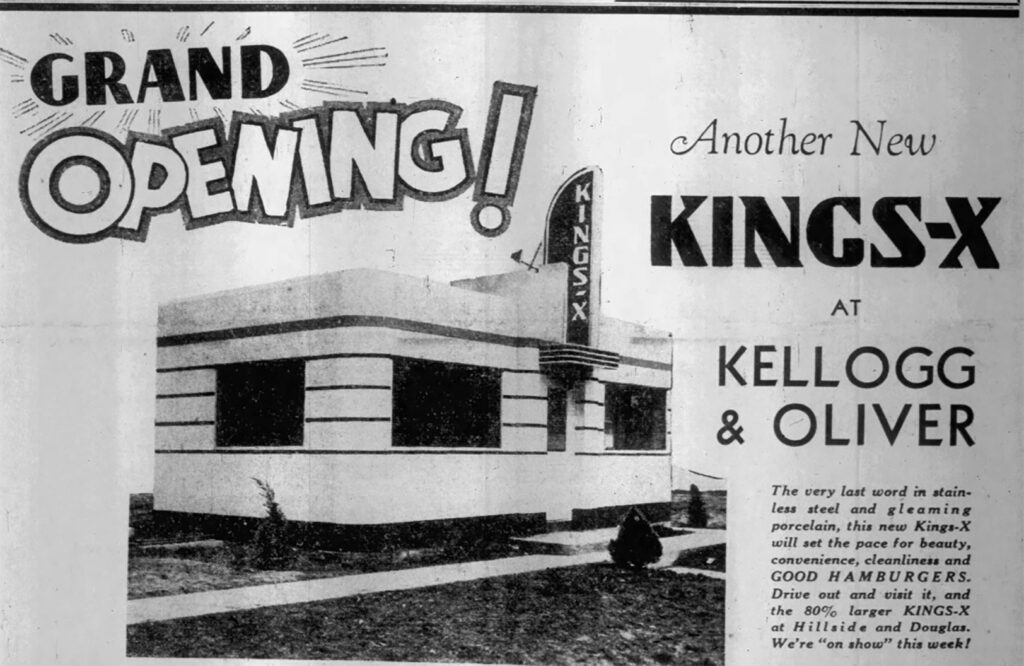 This March 1942 newspaper ad announces a new Kings-X location in Wichita. A.J. “Jimmie” King purchased the Wichita branch of White Castle in 1938 and changed the name to Kings-X. The last location closed in 2012, but “Jimmie’s Diner” — opened by King’s son — still exists. Image from the Wichita Eagle