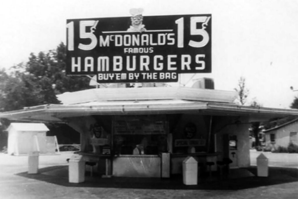 This 1948-era McDonald’s restaurant tagline, “buy ’em by the bag,” is unquestionably derivative of Walt Anderson’s 1910s-era tagline, “sell ’em by the sack.” McDonald’s was originally started by the McDonald brothers in San Bernardino, California, in the 1940s. Photo courtesy of McDonald’s System, Inc.