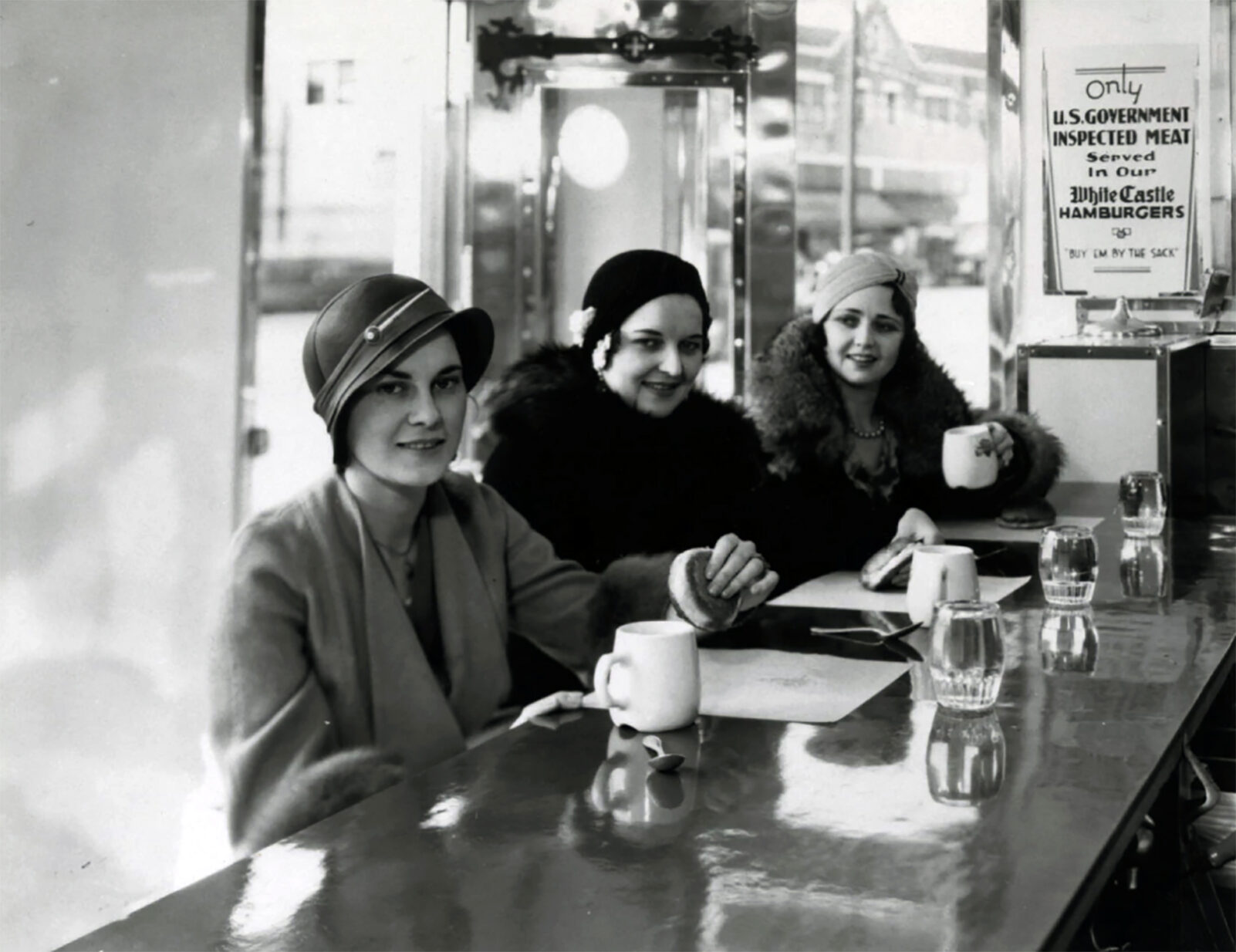 Three young women enjoying coffee and hamburgers at the counter of an unidentified White Castle restaurant, ca. 1930-1939. Photo courtesy of White Castle System, Inc./Ohio History Connection