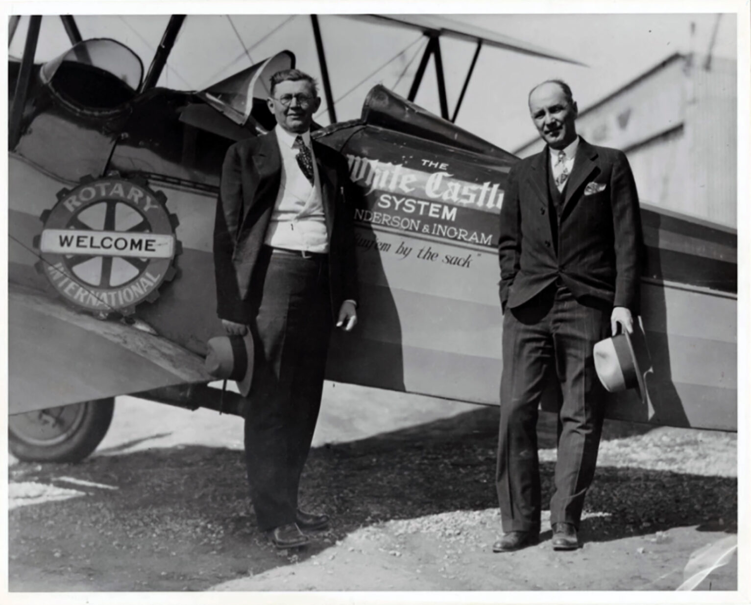 Walt Anderson and Billy Ingram, founders of White Castle Systems, Inc., stand in front of their company airplane. The airplane was purchased in 1927 so they could personally visit all of the White Castle restaurants in their expanding chain. Photo courtesy of White Castle System, Inc./Ohio History Connection