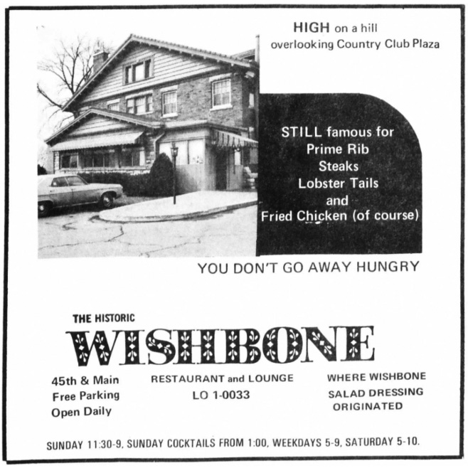 A May 1972 magazine ad shows how the Wishbone restaurant became known for being the place where “Wishbone salad dressing originated” — even after new owners took over; image courtesy of “This Month In Kansas City”