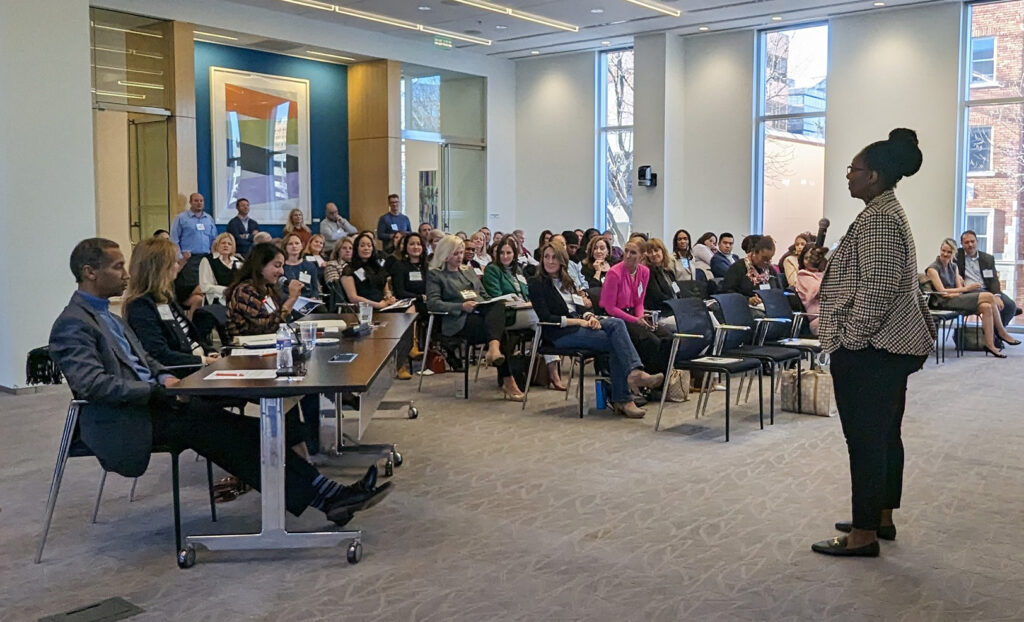 Aviva Ajmera, CEO and founder of SoLVE KC, third from left, speaks April 2024 Dolphin Tank event for Heartland women in tech, organized by Springboard and presented by Women’s Capital Connection and the Women’s Business Center via the OneKC for Women alliance; courtesy photo