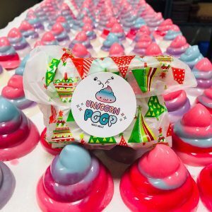 “One of the things that sets us apart is that each cube is decorated to the nines,” he said. “It’ll have hay on it if it’s like a seasonal one, or there’s glitter. We have little gummy bear shapes on top of our gummy bear-scented wax. Of course, our collection of aromas is very quirky.”