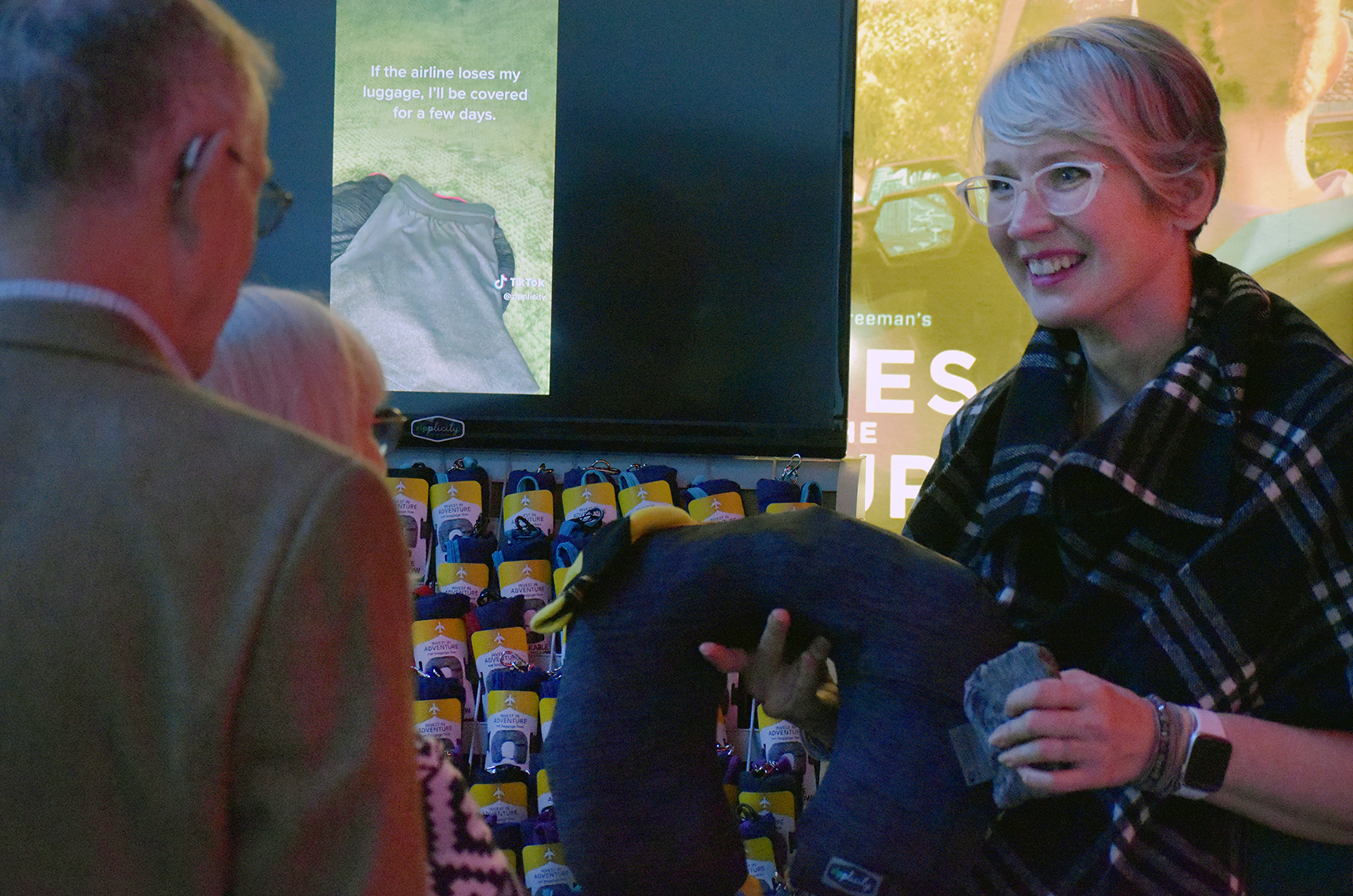 Amber Walderier sells her flagship product, the Travel Neck Pillow, which allows travelers to stuff items inside it that they normally would take up precious space in luggage; photo by Taylor Wilmore, Startland News